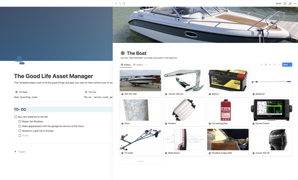 Keep track of all your gear, whether it’s your car, motorcycle, boat, or anything else that adds value to your life and free time. This Notion template is designed to help you stay organized, with a clean and user-friendly interface that you can easily customize to suit your specific needs. It’s fast, visually appealing, and simple to use, giving you peace of mind that everything is in order.